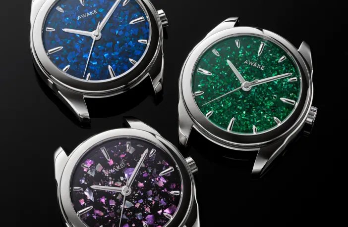Each AWAKE collection introduces a new material or technique at its centre. The Son Maï collection embeds centuries-old Vietnamese lacquer craft — Sơn Mài, a layered sanding process involving silver leaf gilding — into Swiss-made dials. Meteorite slices from 4.5-billion-year-old extra-terrestrial stone. Recycled aerospace titanium. The material is always the story.