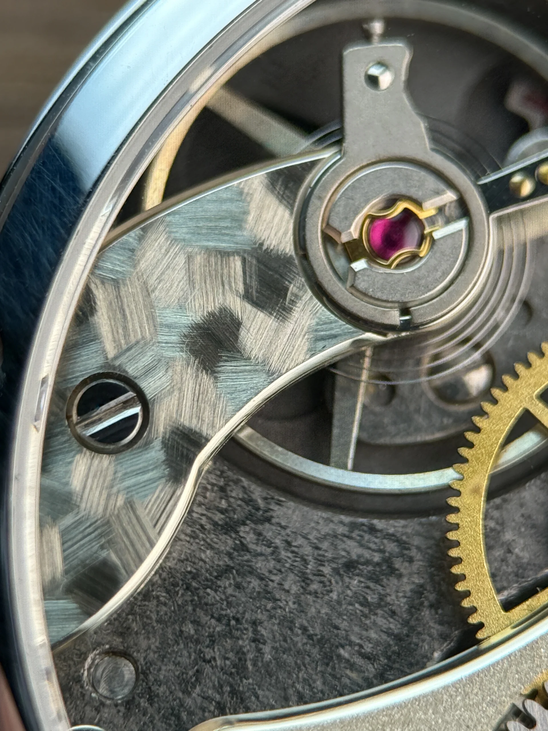 Three techniques define LOTH Watch 1. Mosaic — a term Tristan coined himself — applies homemade carbons in freehand brushstrokes across the dial and balance bridge, each adjacent stroke facing a different direction so no two surfaces reflect light the same way. Snailing decorates the ratchet and crown wheels on the lathe, with the ratchet wheel double-snailed for layered depth. Anglage applies wide, curved polished bevels with sharp internal corners that no machine on earth can replicate.
